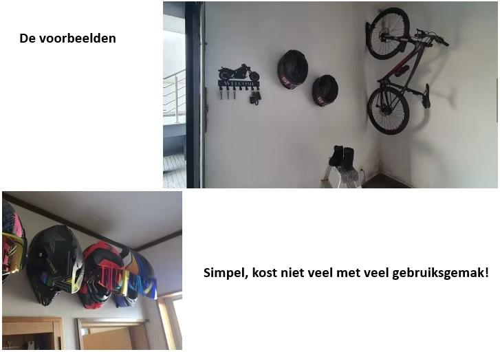 Omdat het hebben van een helm of meerdere helmen zoveel ruimte innemen. Is het vaak een lastige taak om deze op een gepaste wijze op te bergen. Helmen worden vaak ergens gelegd waar ze makkelijk kunnen vallen, omdat er eigenlijk te weinig ruimte is op de plank. De handschoenen blijven bijvoorbeeld in de helm en je zet het soms op de enige plek die er nog beschikbaar is. Om de levensduur van je helm te bewaren en het vallen van een helm te voorkomen. Raden wij aan om een vaste plaats aan de muur te geven om je motorhelm of fietshelm op te hangen. Het ziet er ook veel gaver uit.